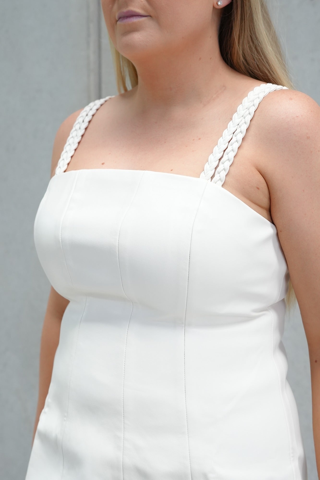 Made of vegan leather, it has a tight fitted bodice with an aline skirt, square neckline, full coverage, braided straps and exposed gold zip on the back.
